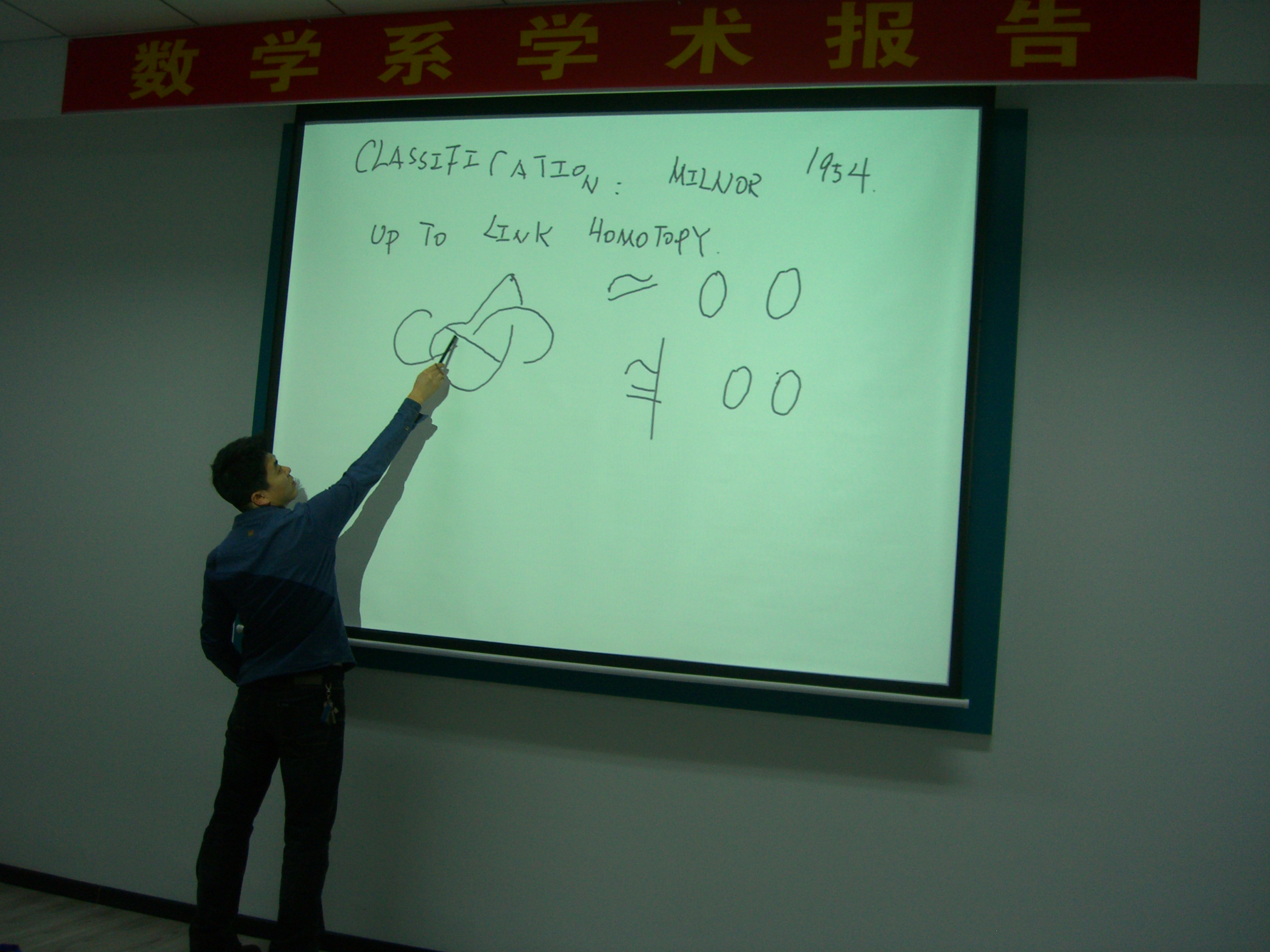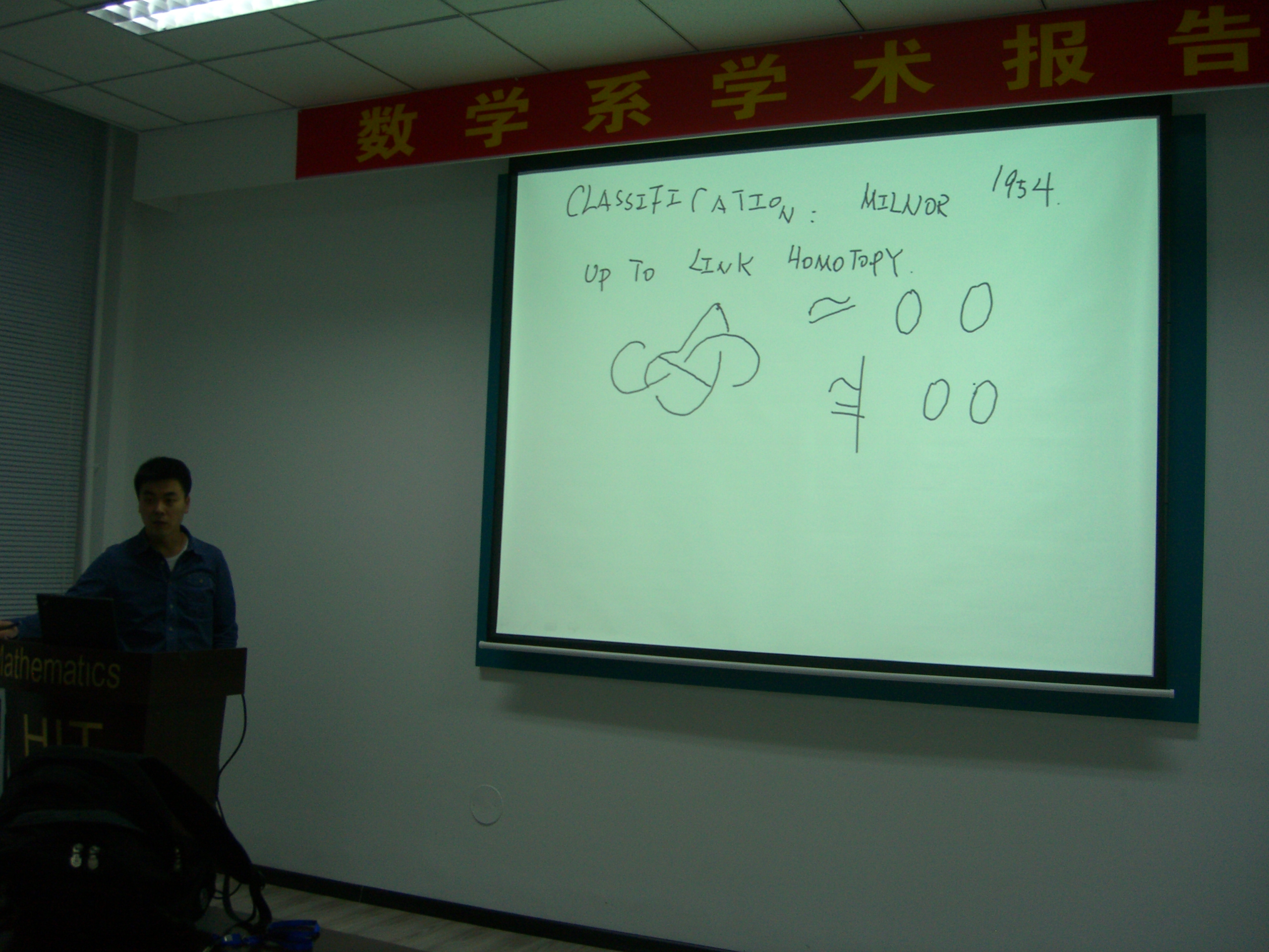2014年2月28日下午16:00时,公司数学系工科数学分析教学中心张宇副教授在格物楼503做了题目为:《On Brunnian link groups》的学术报告,报告由工科数学分析教学中心尹逊波副教授主持。数学系二十余位师生听取了学术报告并进行了热烈讨论。