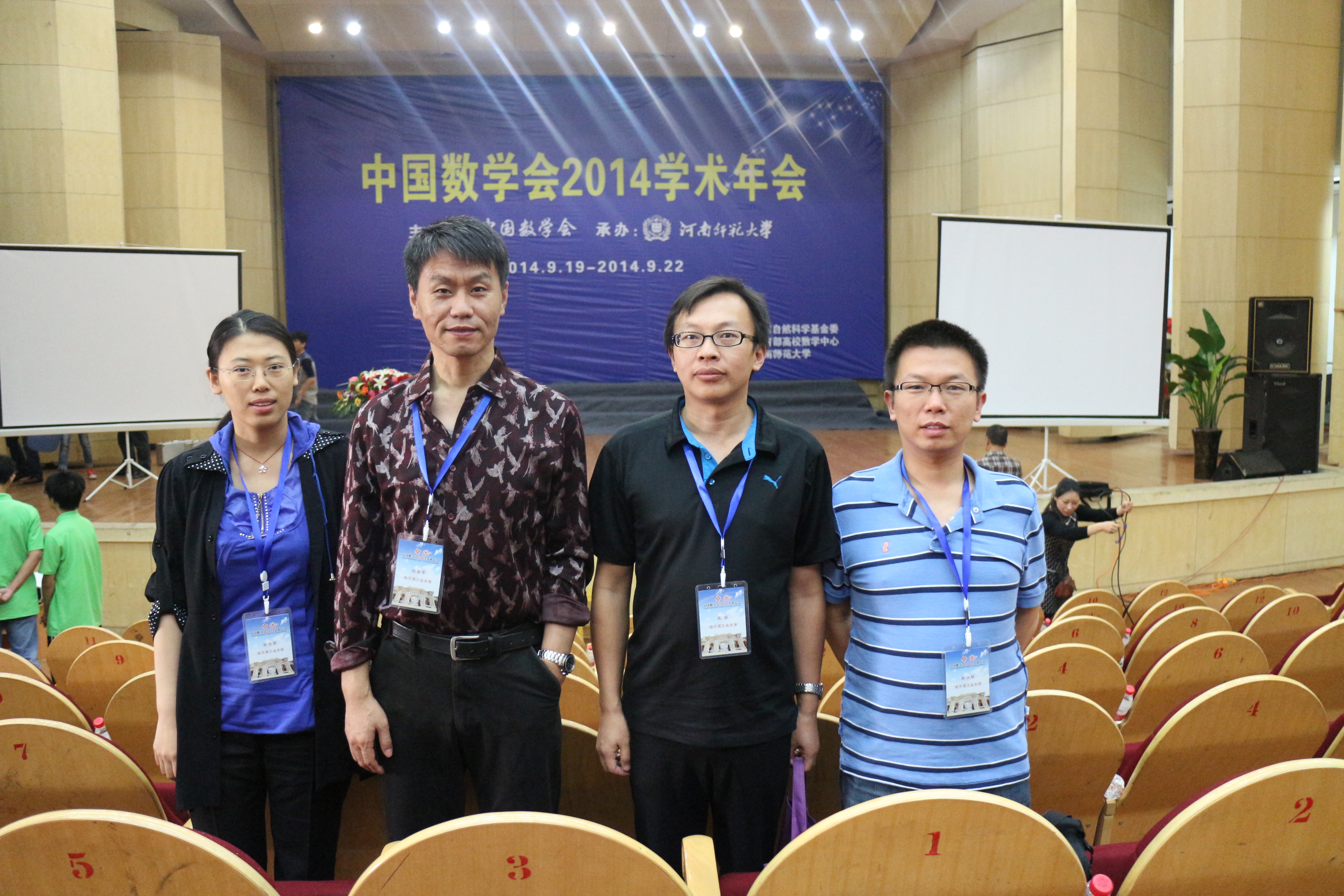 中国数学会2014年学术年会(河南师范大学承办)于2014年9月19日-9月22日在河南省新乡市召开, 我系赵景军教授、陈胜教授、靳水林副教授和陈佳奇博士等参加了此次会议。 | 本次大会吸引了五百余位数学领域的华人专家学者参会,国际知名数学家辛周平、包刚、阮勇斌等三人应邀做了大会报告;90多位专家应邀做了分组邀请报告, |