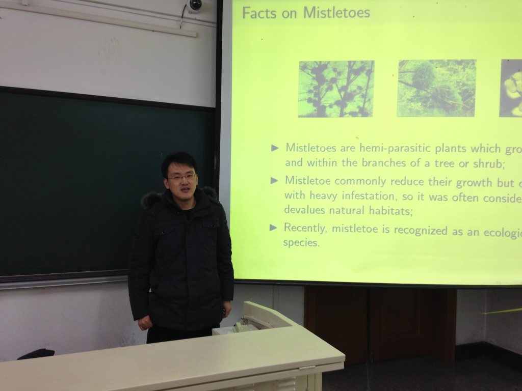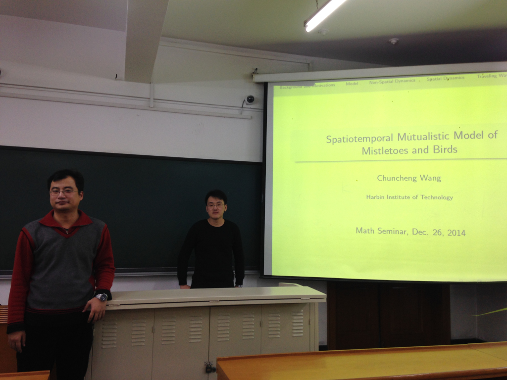 2014年12月26日下午15:00,基础数学研究所王春程博士在诚意楼213做了题为《Spatiotemporal Mutuatistic Model of Mistletoes and Birds》的学术报告,报告由陈勇副教授主持,数学系若干位教师听取了报告,并就相关问题进行了讨论。