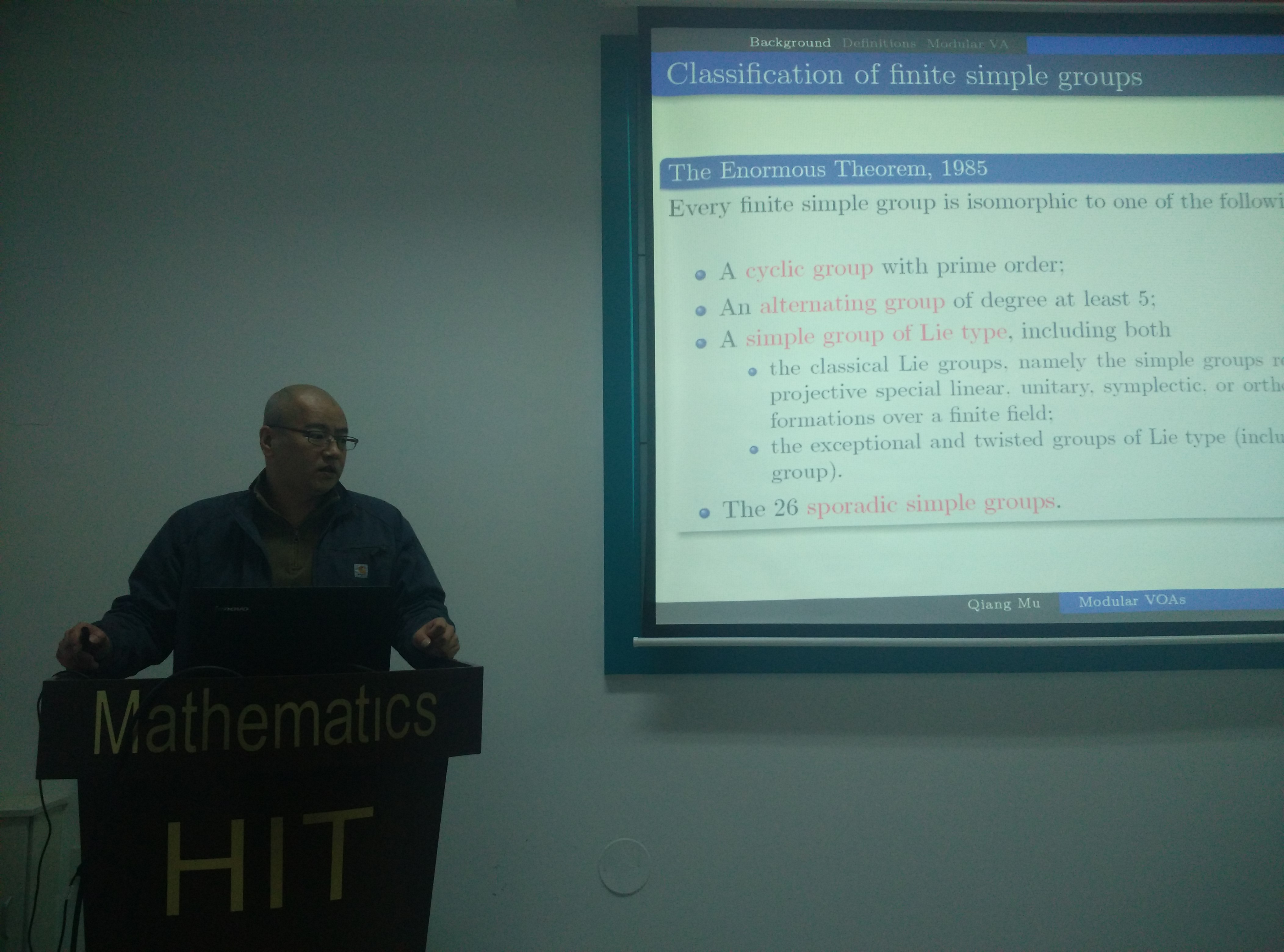 2015年4月24日下午16:00, 哈尔滨师范大学穆强副教授在数学系会议室(格物楼503)做了题为《Modular vertex operator algebras》的学术报告,报告由尹逊波副教授主持,数学系十余位师生听取了报告并就相关问题进行了讨论。