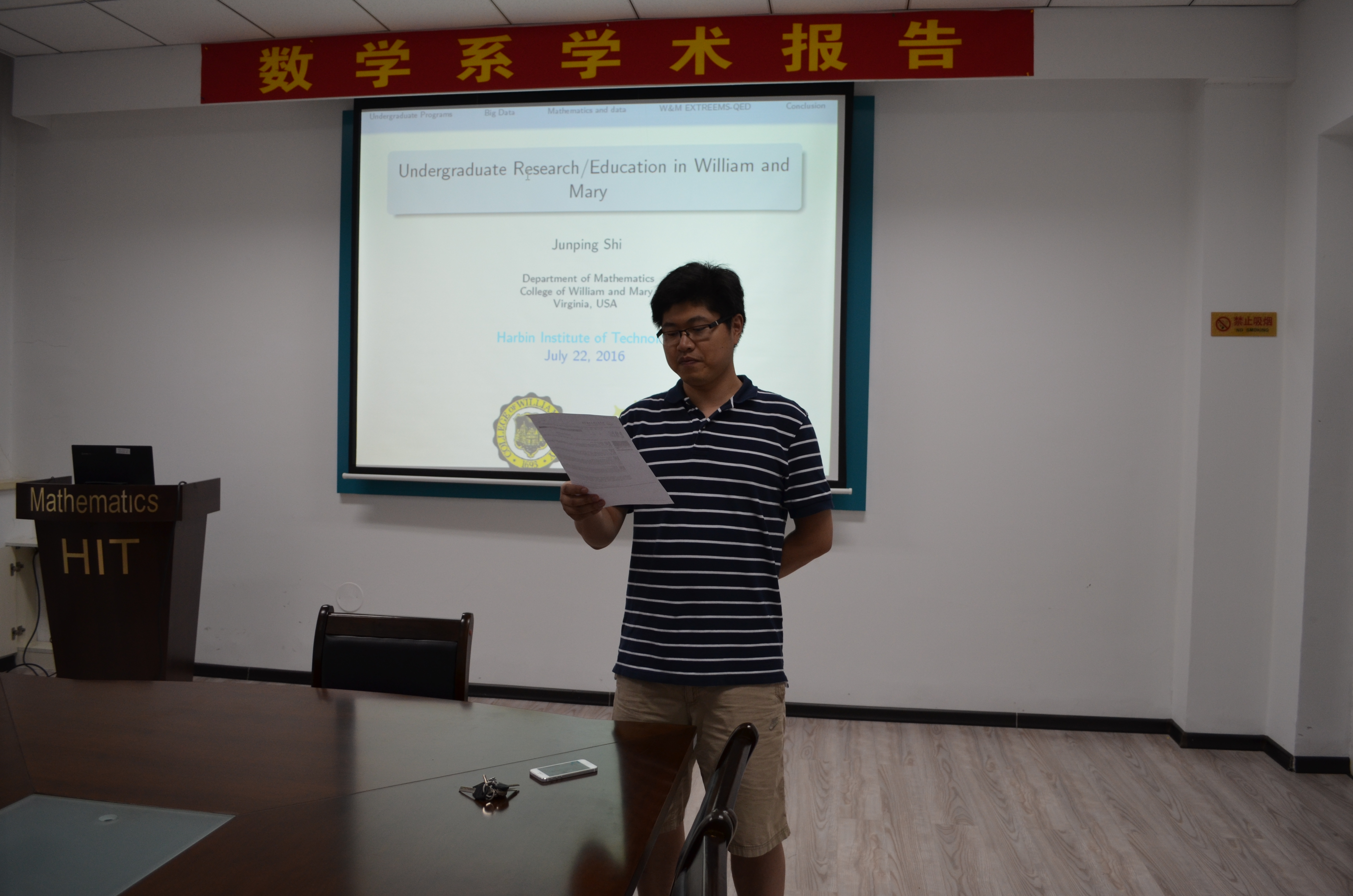 2016年7月22日下午,美国威廉玛丽公司史峻平教授在数学系会议室(格物楼503)做了2两场精彩的报告,题目分别为:《数据科学,计算数学和生物数学的旗下产业和研究》《Global Extinction of Population with Allee effect in Advective Environment》,报告由方健教授主持,数学系10余位师生听取了报告并进行了热烈的讨论。