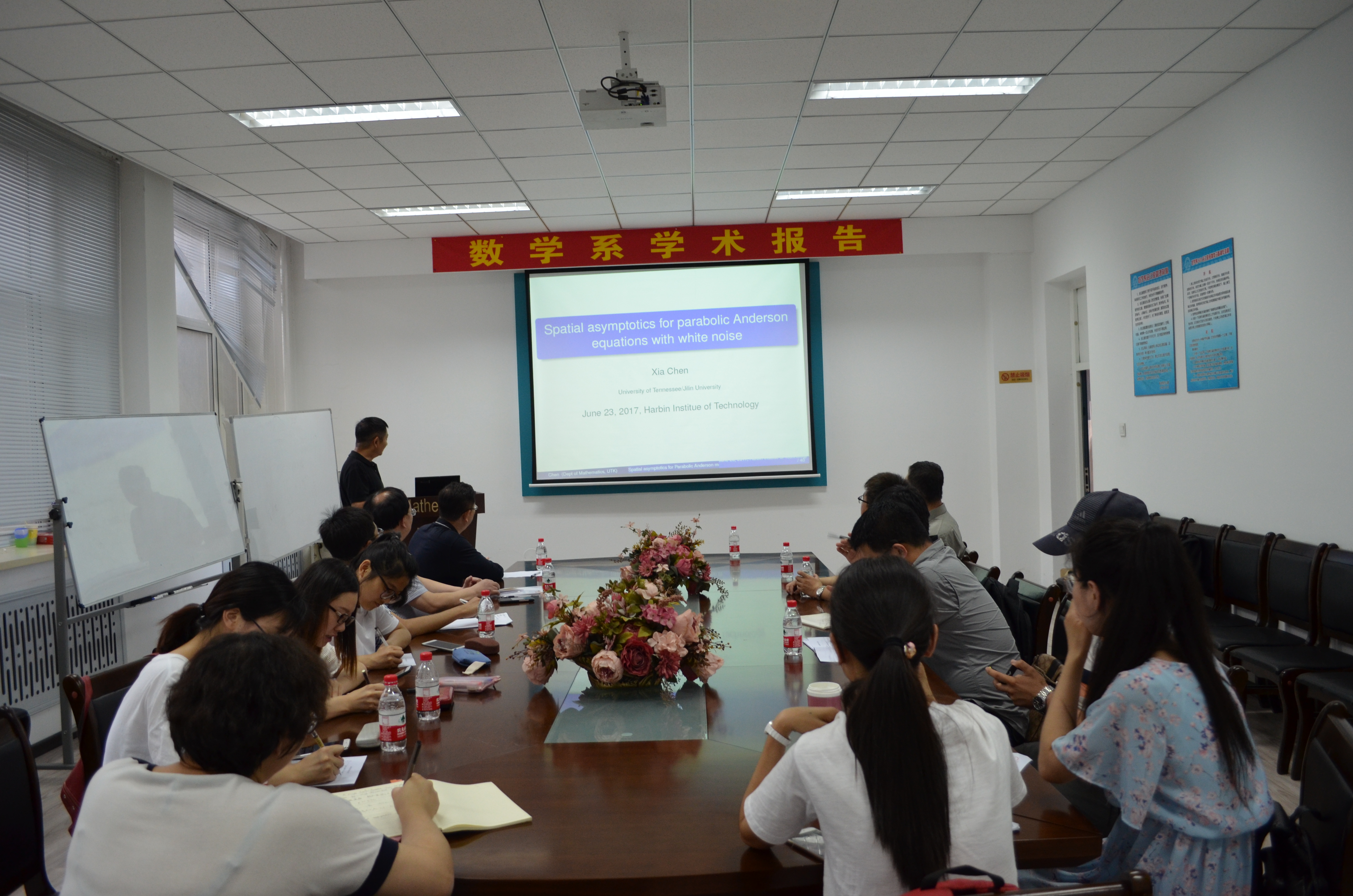应Mksport体育数学系田波平教授邀请,吉林大学特聘教授陈夏于2017年6月23日(周五)在Mksport体育数学系进行学术访问,并于15:00-16:30在格物楼503会议室作学术报告,报告题目为:Spatial asymptotics for the parabolic Anderson models with generalized time-space Gaussian noise。报告由付永强教授主持,数学系20余位师生听取了报告,并进行了热烈的讨论。