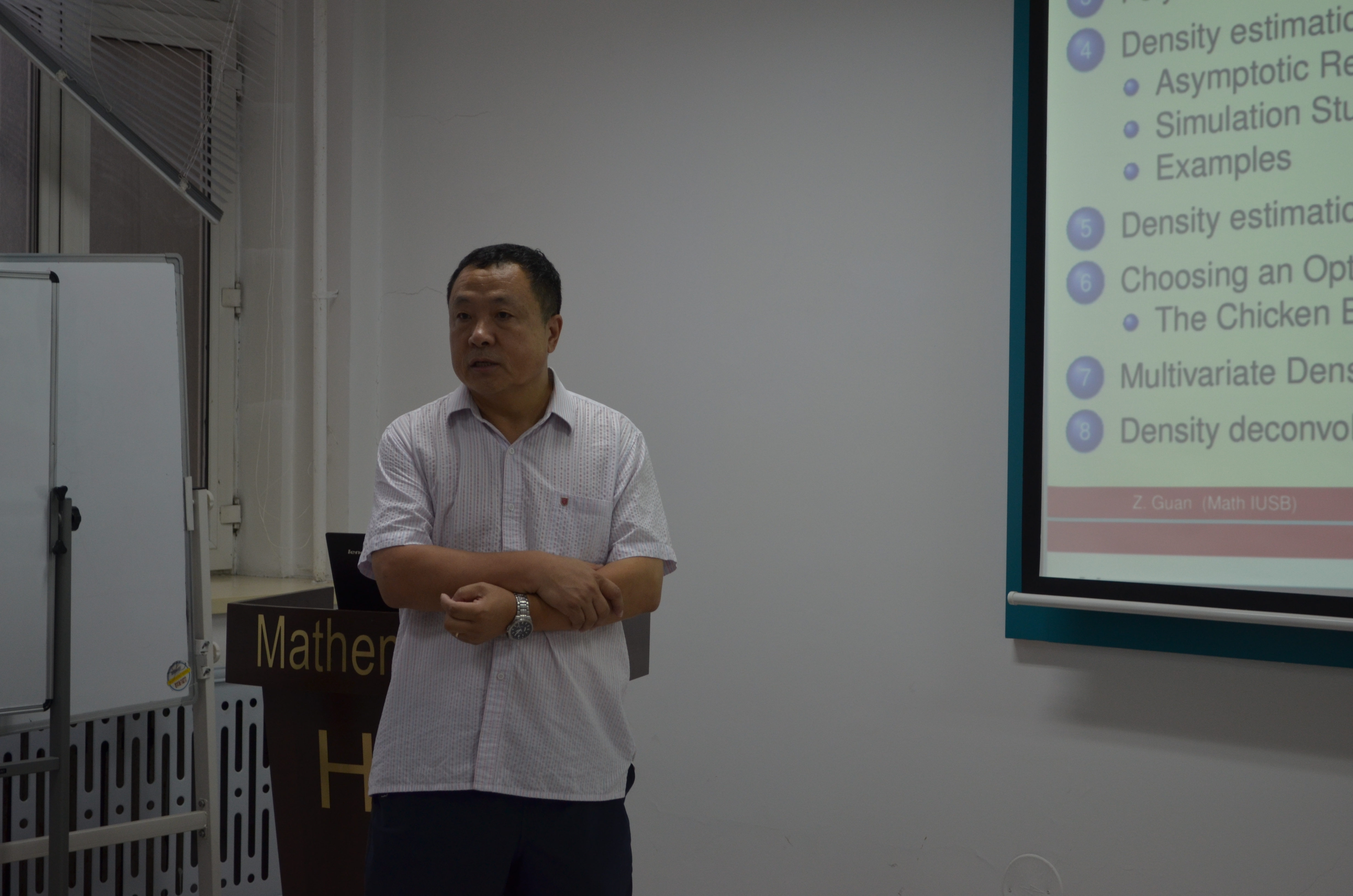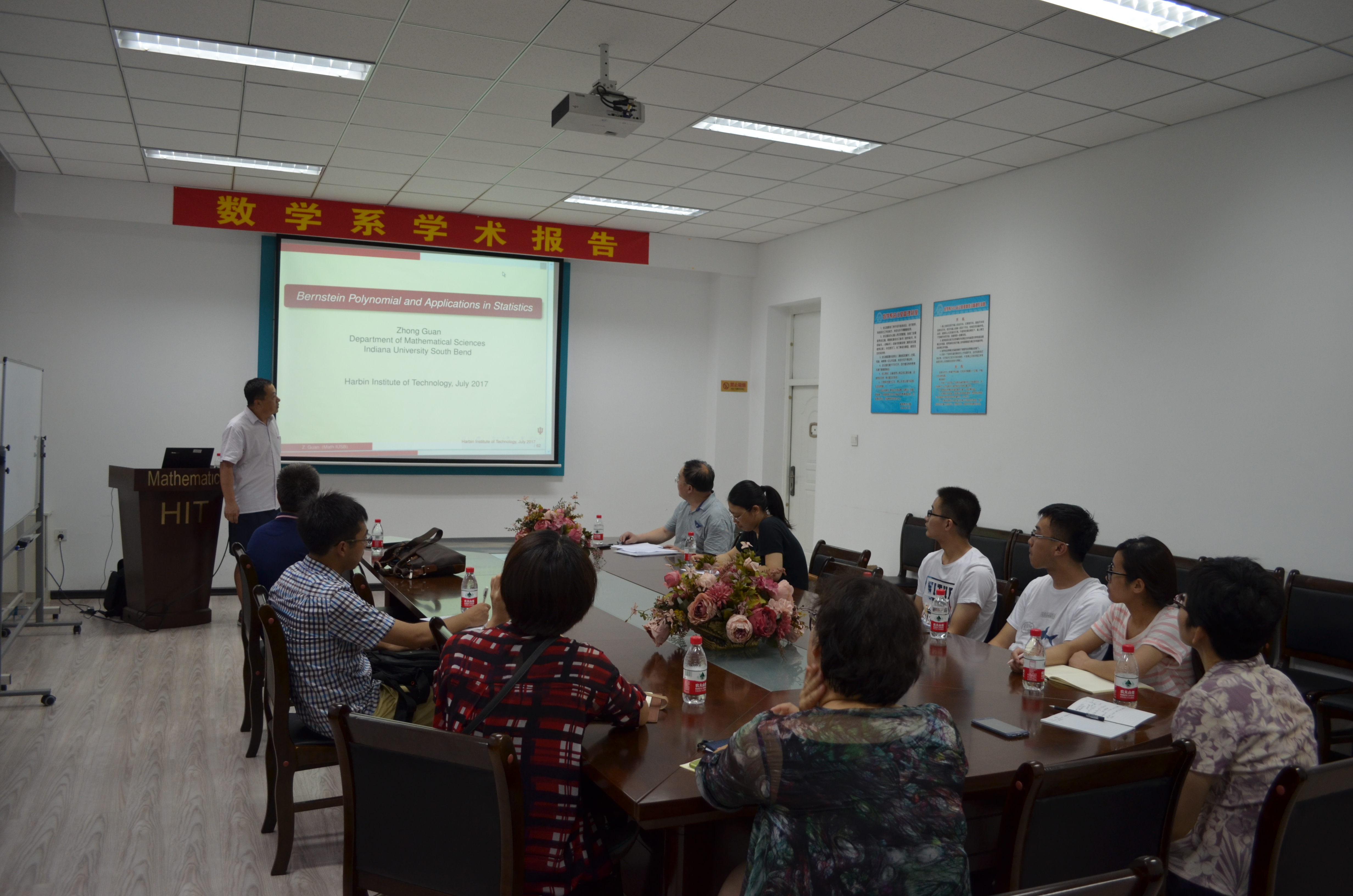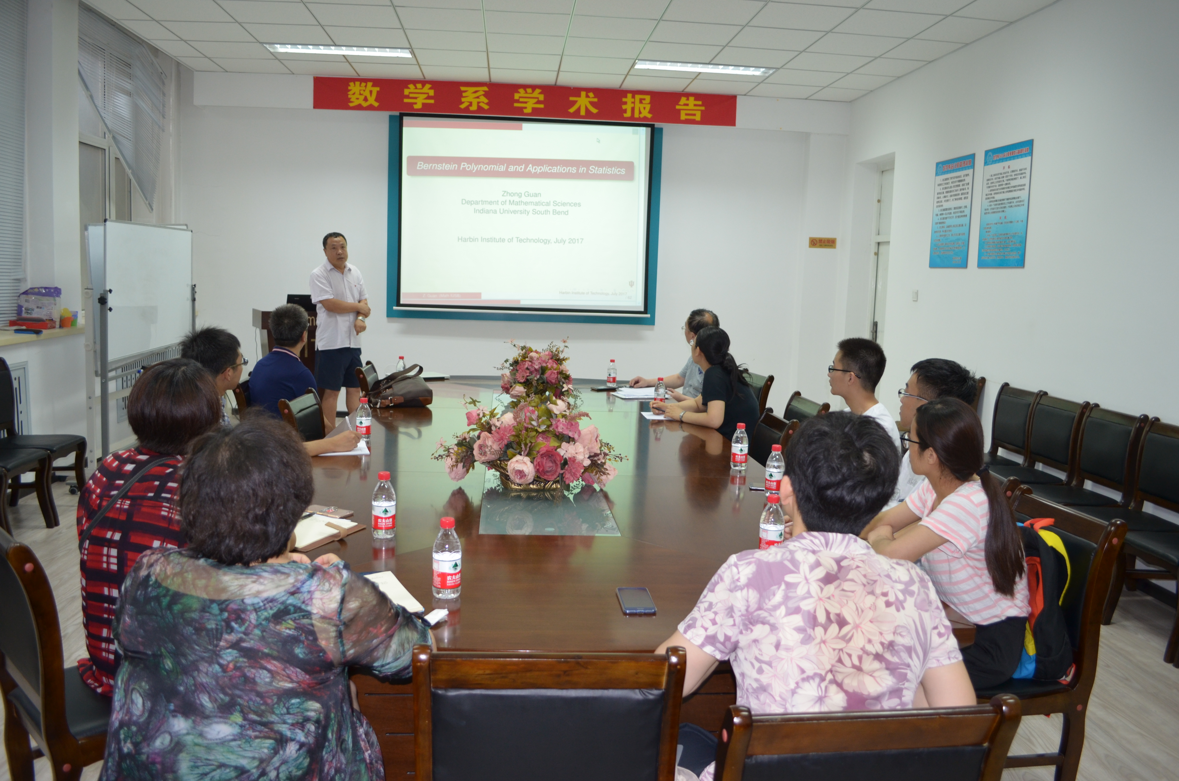应数学系田波平教授邀请,美国印第安纳大学南本德分校关忠教授访问数学系并作报告。关忠教授于2017年7月17日 下午14:00--17:00和2017年7月19日 上午9:00--12:00分别在格物楼503和正心楼111报告厅,分别作了:Optimal Combination of Biomarkers for Time-dependent ROC Estimation and Related Problems、Introduction to Bernstein polynomial and iterated Bernstein polynomial、Polynomial with positive coefficients--another generalization of Bernstein polynomial和Multivariate polynomial with positive coefficients and it's applications in statistics的四个报告。报告由田波平教授主持,数学系10余位师生听取了报告,并进行了热烈的讨论。