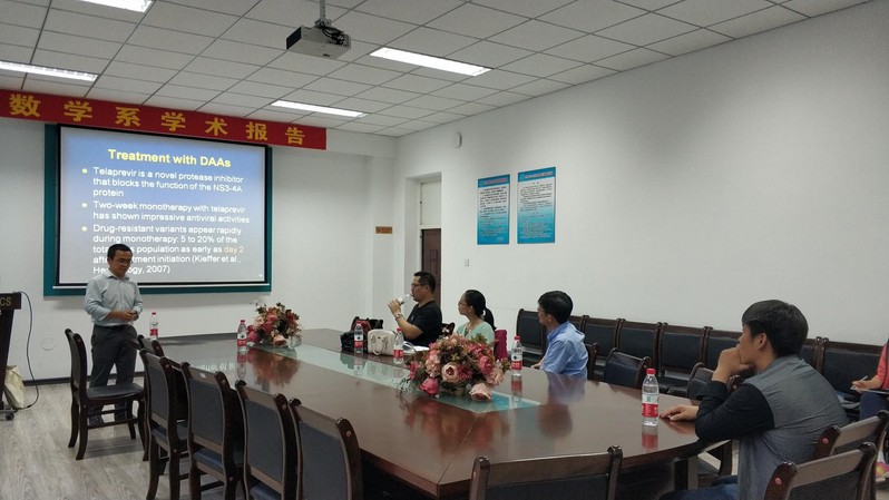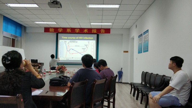 第一场报告时间为6月27日下午14:30-17:30,地点为格物楼503室,总共两个报告。荣礼彬教授分别以“Modeling HIV persistence, latent reservoir, and viral blips”、“Modeling hepatitis C virus infection and treatment”为题系统地讲述HIV、HCV模型建模中病毒载量持续性、联合用药治疗、疗效间的相互关系。