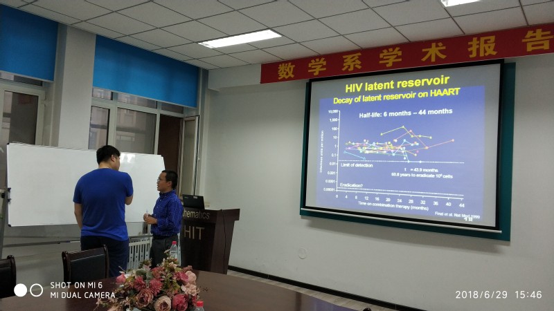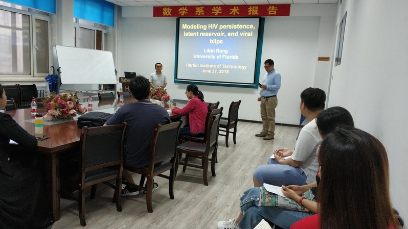 受公司国际合作与交流基金资助,应数学系刘胜强教授邀请,美国佛罗里达大学荣礼彬(Libin Rong)教授于2018年6月26-7月3日来哈工大数学系进行了成功的学术访问,访问期间,荣礼彬教授举行了病毒动力学模型系列专题讲座并与我系师生进行了多次学术交流活动。