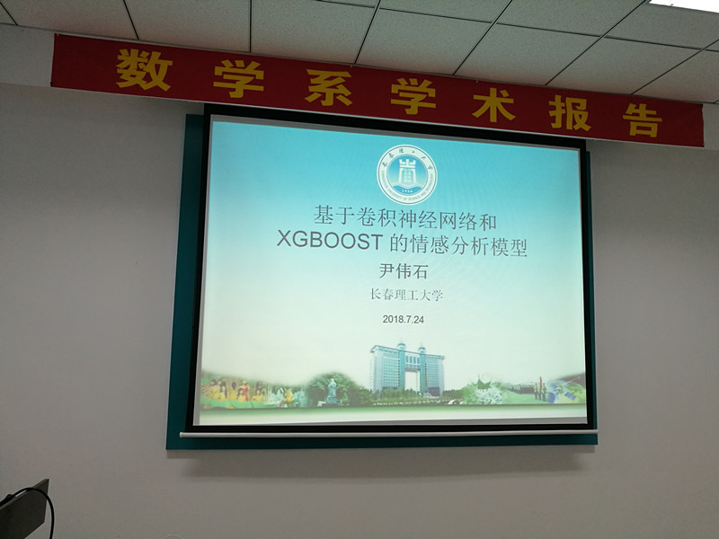 受数学系郭玉坤副教授邀请,长春理工大学数学系尹伟石副教授于近期访问了公司,并于2018年7月24日上午10:00-11:00在格物楼503报告厅进行了一场学术报告。尹老师以基于卷积神经网络和XGBOOST 的情感分析模型为题进行了学术讲座,介绍了相关领域内的最新进展和成果。报告由郭玉坤副教授主持,数学系的师生在报告现场与尹老师进行了热烈的交流与讨论。