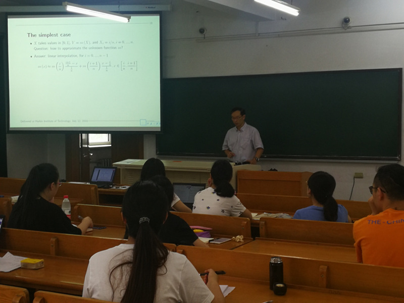 应哈工大数学系田波平教授的邀请,美国密西根州立大学杨立坚教授于2018年7月11日至7月19日来哈工大数学系进行了成功的暑期学术访问,访问期间,杨立坚教授就“单变量非参数回归问题”、“样条回归的收敛性”、“非参数回归中的样条函数光滑化”和“可加模型的样条回归性质”等专题作了系列学术报告和学术讲座。