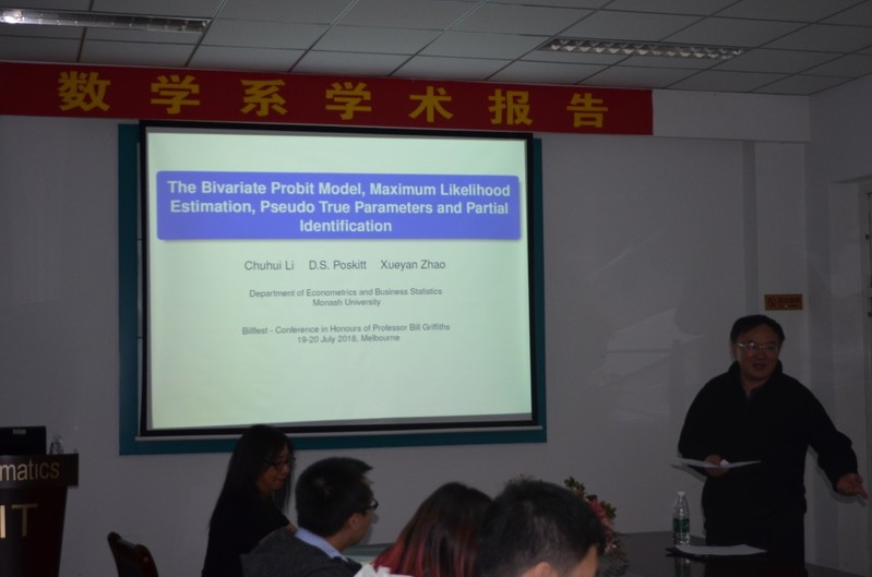 第二场报告时间为9月18日上午8:30-11:30,地点为格物楼503室,总共有两个报告“Binge Drinking and Antisocial and Unlawful Behaviours in Australia”、“Patient Safety in Hospitals - A Bayesian Analysis of Unobservable Hospital and Specialty Level Risk Factors”,赵教授的这两个报告围绕着统计理论中及其重要的方法——Bayes方法,对含不可观测变量的模型进行了分析,对风险因子模型做了全面的阐述,并就莫纳什大学的研究生和旗下产业问题和参加报告的师生进行了深入的交流。