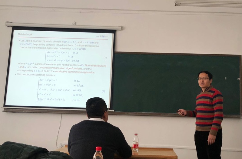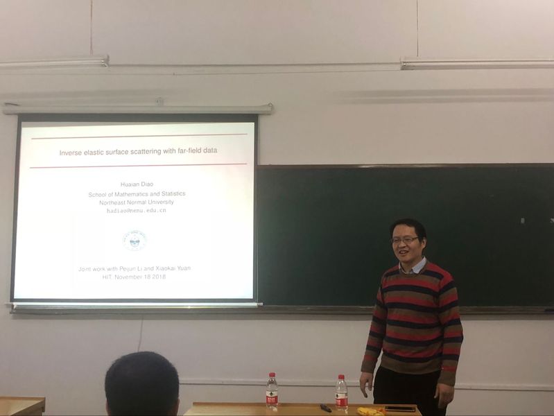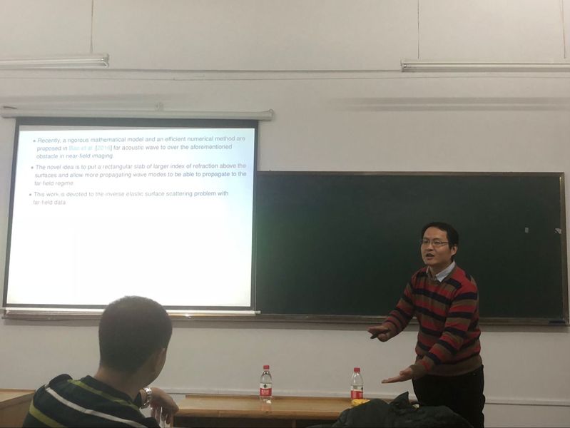 应数学系郭玉坤副教授的邀请,东北师范大学数学与统计公司刁怀安副教授于2018年11月18至20日到公司进行了学术访问。刁怀安老师分别于18日下午15:00-16:00和20日上午10:00-11:00在格物楼522报告厅做了两场学术讲座,报告内容涉及弹性波反散射、传输特征函数的几何应用等。报告由郭玉坤副教授主持,数学系相关方向的师生参加了报告会并与刁怀安老师进行了热烈的学术交流与讨论。