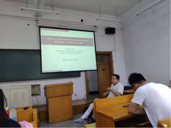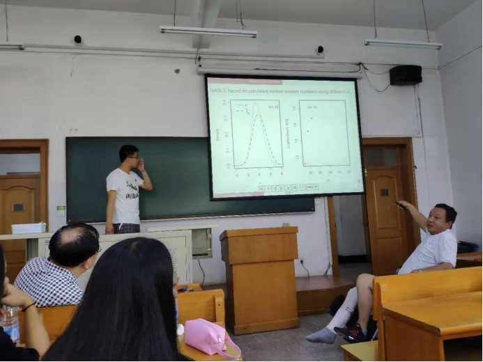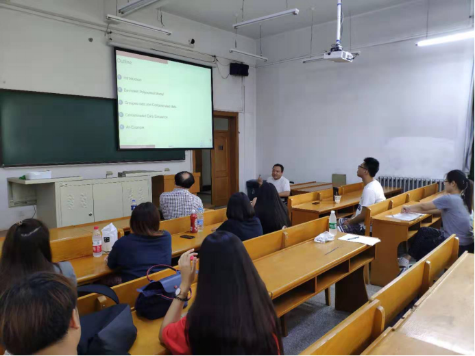 第二场报告时间为7月20日上午9:30-12:10,地点为诚意楼102室,两个报告分别为“Bernstein polynomial model for grouped continuous data”、“Maximum Approximate Bernstein Likelihood Estimation in Some Semiparametric Models”。关忠教授的这两个报告围绕着分组样本数据下半参数模型概率密度函数的伯恩斯坦多项式近似,并结合实际数据进行了分析。