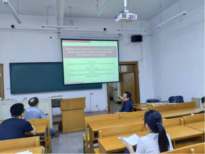 第一场报告时间为7月18日下午14:00-17:00,地点为诚意楼102室,共两个报告。关忠教授分别以“Semiparametric maximum likelihood inference for nonignorable nonresponse with callbacks”、“Bernstein Polynomial Model for Nonparametric Multivariate Density”为题系统地讲述缺失数据概率密度函数的极大似然理论及伯恩斯坦多项式似然估计,并介绍了多元伯恩斯坦多项式的相关理论,以及运用EM算法及Bootstrap方法进行模型估计等问题。