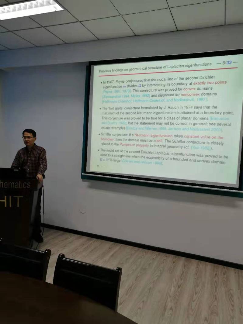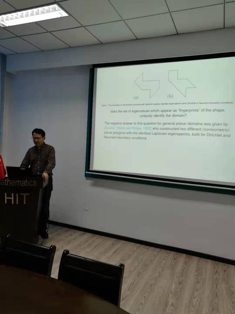 应MK体育郭玉坤副教授邀请,东北师范大学数学与统计公司刁怀安副教授于近期访问了公司,并于2019年10月31日上午11:00-12:00在格物楼503报告厅进行了一场学术讲座。刁老师以On nodal and generalized singular structures of Laplacian eigenfunctions and applications to inverse scattering problems为主题为公司师生做了一场精彩的学术报告,介绍了拉普拉斯算子特征函数在反散射问题上的应用。报告由郭玉坤副教授主持,MK体育的师生在报告现场与刁老师进行了热烈的交流与讨论。