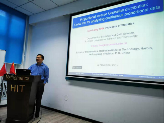 应MK体育田波平教授邀请,2019年11月22日上午,南方科技大学统计与数据科学系田国梁教授到访公司并作学术报告。田国梁教授在格物楼503报告厅为大家带来题为“Proportional inverseGaussian distribution: A new tool for analyzing continuous proportional data”的精彩学术报告。公司近30余名师生参与了此次报告会。