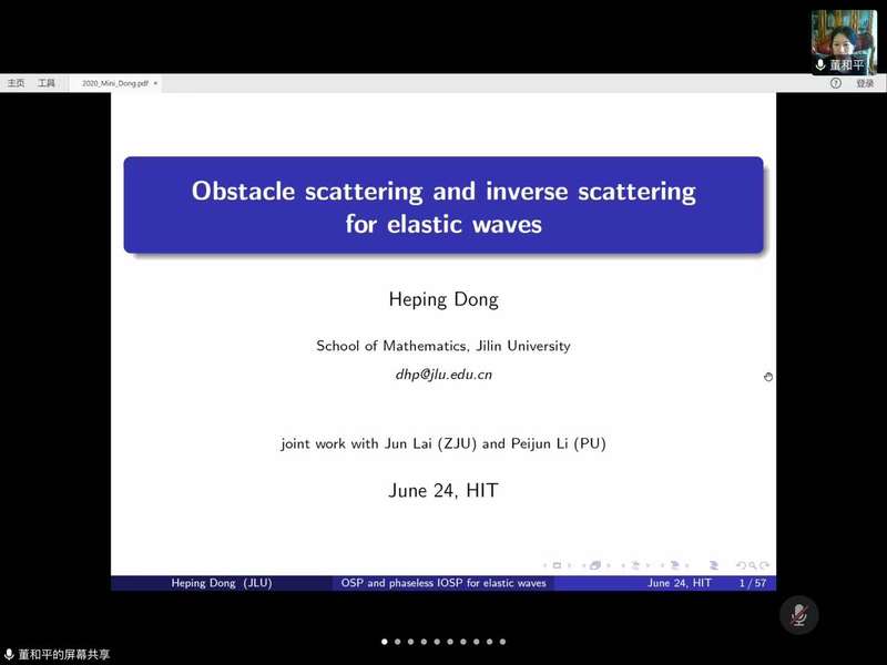 应MK体育郭玉坤副教授邀请,吉林大学MK体育董和平副教授于2020年6月24日上午10:00-11:30为公司做了一场在线学术讲座。报告的平台为腾讯会议,会议ID为812 894 313。董老师以Obstacle scattering and inverse scattering for elastic waves为主题为公司师生做了一场精彩的学术报告,介绍了弹性波障碍散射问题的积分方程方法和无相位反散射问题的参考球算法等前沿课题和最新进展。报告由郭玉坤副教授主持,三十余名师生参加了此次在线学术活动,并在会议平台与董老师进行了热烈的交流与讨论。