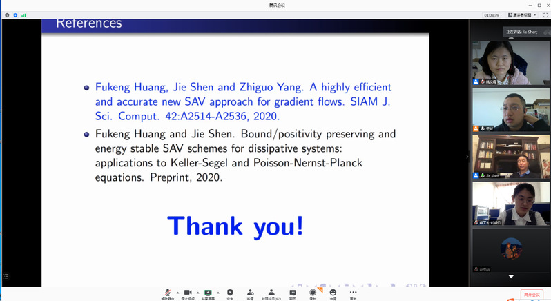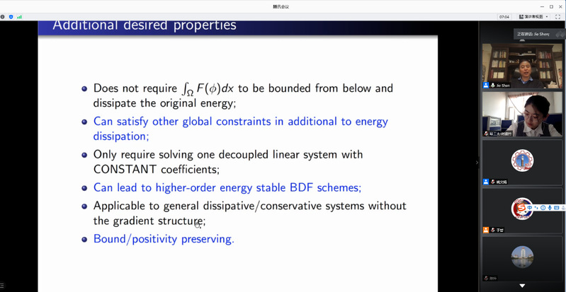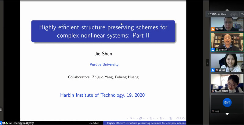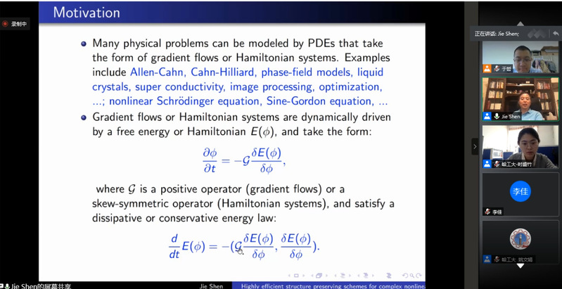 应MK体育计算数学系的邀请,美国普渡大学与厦门大学应用与计算数学中心主任沈捷教授于2020年10月12日上午8:00-11:30及2020年10月19日上午8:00-11:30为公司做了四场在线学术讲座。报告的平台为腾讯会议。沈捷教授以Highly efficient structure preserving schemes for complex nonlinear systems和Highly efficient and accurate structure preserving schemes for complex nonlinear systems为题目为公司师生共做了四场精彩的学术报告,介绍了流体力学中高效快速无条件稳定数值算法及其发展,给出了相关数值算例与数值模拟等实际应用。报告由姚文娟老师主持,MK体育近70名师生参加了该系列在线学术活动,并在会议平台与沈教授进行了热烈的交流与讨论。