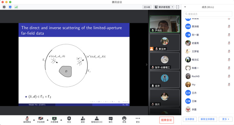 应MK体育郭玉坤副教授的邀请,长春理工大学数学系尹伟石副教授于2020年11月10日下午15:00-16:30为公司做了一场在线学术讲座。报告的平台为腾讯会议。尹老师以A neural network scheme for recovering scattering obstacles with limited phaseless far-field data为题目为公司师生做了一场精彩的学术报告,介绍了使用机器学习算法重构声波障碍物形状的反散射问题,报告了相关的数学理论和数值算法等前沿课题和最新进展。报告由郭玉坤副教授主持,30余名师生参加了此次在线学术活动,并在会议平台与尹老师进行了热烈的交流与讨论。