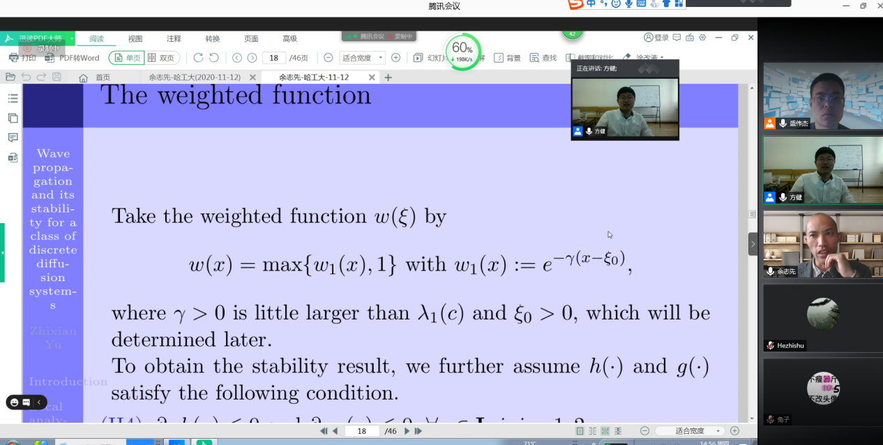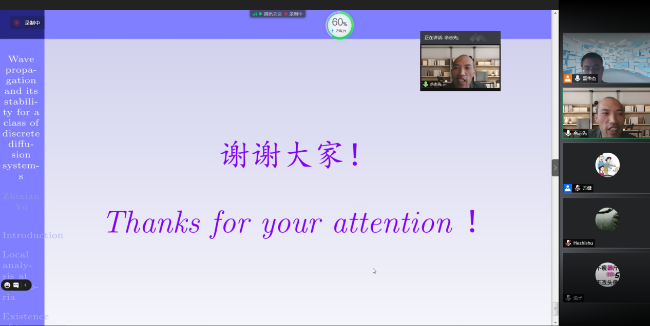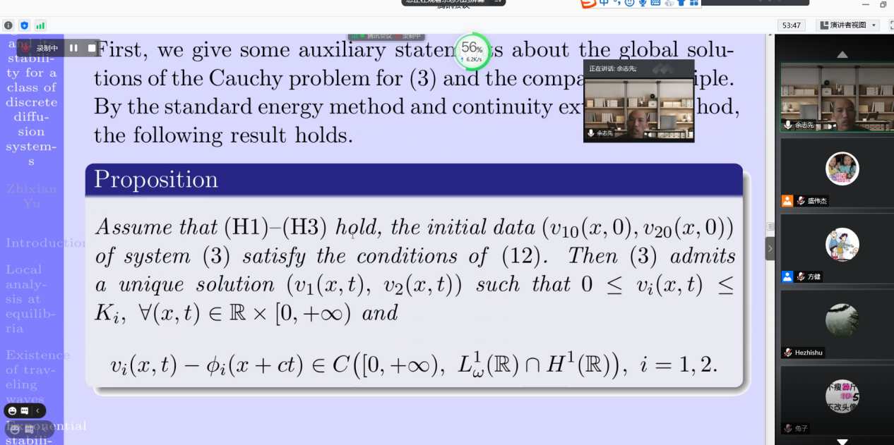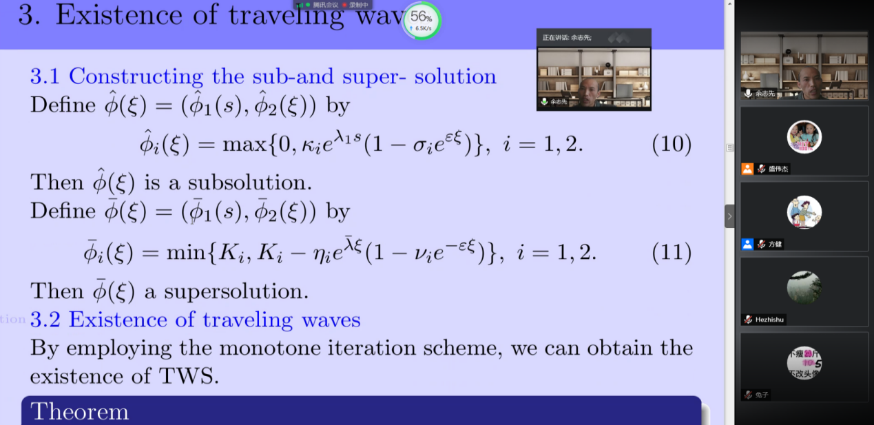 应MK体育盛伟杰副教授邀请,上海师范大学余志先副教授于2020年11月12日下午14:00-15:00为公司师生做了一场在线学术讲座。报告平台为腾讯会议。余志先副教授以Wave propagation and its stability for a class of discrete diffusion systems为题目。余老师的报告介绍了两种群离散扩散系统行波解的存在性和指数稳定性,并将该结果延拓到一般的离散系统,同时对于相关问题的最新进展进行了详细的讲解。报告由盛伟杰副教授主持,近三十名师生参加了此次在线学术活动,并在会议平台与余老师进行了热烈的交流与讨论。