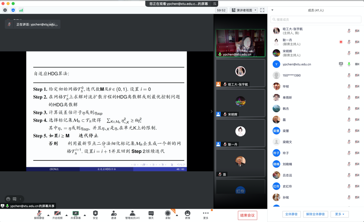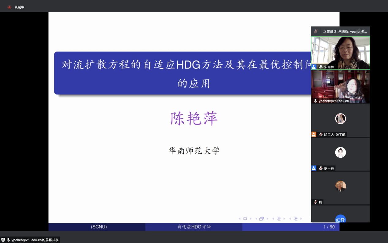 应MK体育宋明辉教授的邀请,华南师范大学数学科学公司陈艳萍教授于2020年12月25日上午10:00-11:00为公司做了一场精彩的在线学术讲座。报告平台为腾讯会议。陈艳萍教授的报告题目为Adaptive hybridizable discontinuous Galerkin method for convection diffusion equations with application to optimal control 。陈教授介绍了对流扩散方程的可混合不连续Galerkin方法的后验误差分析,并将其应用到最优控制问题。报告由宋明辉教授主持,四十余名师生参加了此次在线学术活动,并在会议平台与陈教授进行了热烈的交流与讨论。