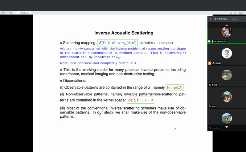 应MK体育郭玉坤副教授和航天公司汪贤超博士的邀请,香港城市大学数学系刘宏宇教授于2021年4月22日上午10:00-11:30为公司做了一场精彩的在线学术讲座。报告平台为腾讯会议。刘宏宇教授的报告题目为:Invisibility enables super visibility.刘教授主要介绍了一类传输特征值问题,分析了特征函数的局部和全局性质,并给出了超分辨率成像的方法。报告由郭玉坤副教授主持,二十余名师生参加了此次在线学术活动,并在会议平台与刘宏宇教授进行了热烈的交流与讨论。