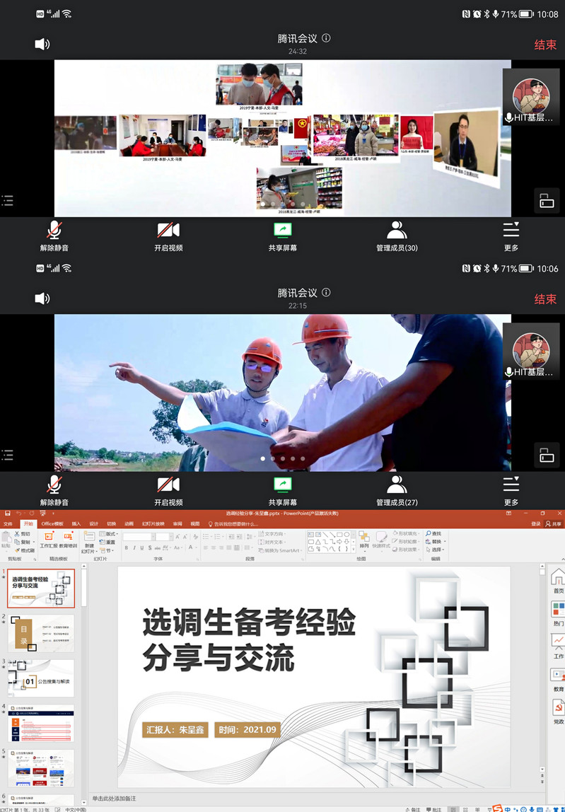 首先,通过《我是哈工大选调生》视频,徐洋带领同学们了解了公司部分选调生在基层工作中的收获与发展。随后,徐洋分别从选调生的概念、选调程序、考核方式以及去年部分省份在公司招录选调生的政策进行详细的解读。徐洋引用习近平总书记的话,“希望越来越多年轻人,到基层和人民中去建功立业,让青春之花绽放在祖国最需要的地方,在实现中国梦的伟大实践中书写别样精彩的人生!”接下来,2021年江苏选调生朱呈鑫向同学们分享了自己选择选调的心路历程,并结合自身经历详细地分享了资料搜集、笔试准备、面试和政审等环节,他表示,希望能有越来越多的哈工大人为祖国的发展贡献自己的力量,投身于实现中华民族伟大复兴的征程中!最后,在互动交流环节,徐洋和朱呈鑫就同学们感兴趣的问题进行了详细的解答。