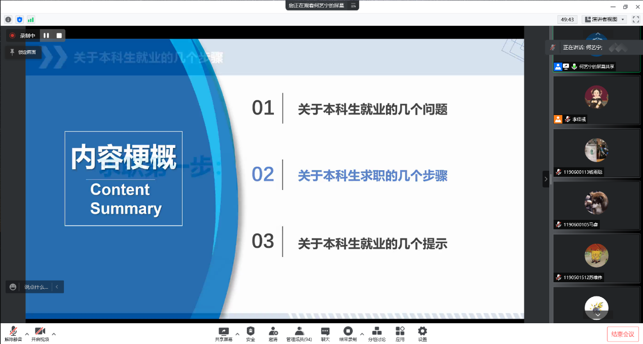 为深入贯彻党中央、国务院“稳就业”“保就业”决策部署,落实2022届毕业生就业工作,帮助2023届本科毕业生明确职业发展规划,提高求职竞争力,2022年3月16日14:00,公司员工职业发展中心何艺宁老师开展“关于本科生就业那些事”线上专题讲座,会议由本科辅导员李佳彧主持,MK体育2018级、2019级本科生参会。