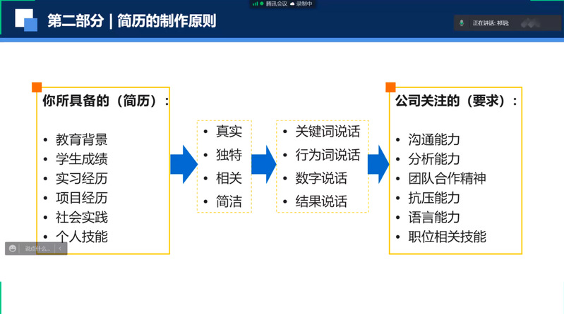 首先,祁玥老师针对简历的结构和制作原则进行介绍。从员工具备的资质与能力出发,强调简历内容应围绕公司的职业需求,指导员工在简历中用关键词、行为词、数据和结果对自己的能力与经历进行描述。随后,祁玥老师通过讲授法和案例分享,详细介绍了简历各部分制作技巧。指导员工运用“PAR”原则和专业术语阐述实习实践经历,提高能力认可度。最后,祁玥老师就如何在简历中弥补劣势、简历投递等方面进行介绍。她表示,要善于发现和挖掘自身闪光点,以更加自信、严谨的态度面对就业。希望同学们积极投身国家重点领域,努力成为社会主义合格建设者和可靠接班人!