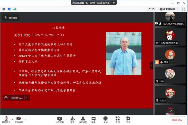 随后,团委组织部干事王震同学带领大家共同追思龙江英烈和哈工大“八百壮士”吴从炘先生。同学们重温了赵一曼女士、杨靖宇先生的英烈事迹,被他们为革命不惜牺牲生命的大无畏精神深深感动。而如今,哈工大“八百壮士”也始终把国家需要、时代使命当成自己的追求,在教学、科研等各领域取得一项又一项丰硕成果。MK体育吴从炘先生用实际行动诠释了他的许党报国之心,哈工大“八百壮士”精神永垂不朽。朱海鹏同学表示:“时间的长河流淌不息,却冲不淡我们对英雄先烈的缅怀。杨靖宇、赵一曼等革命烈士,还有吴从炘等哈工大“八百壮士”奋斗一生的这广袤的黑土地,如今已鲜花朵朵,绿树成荫,人才辈出,我们要珍惜现在来之不易的生活,更要懂得所肩负的历史责任和使命。”