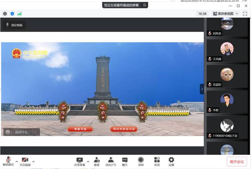 首先,符嘉益同学带领大家一起缅怀烈士,回顾了烈士代晋恺、张抗美在一线救援工作中为人民牺牲的光荣事迹,同学们怀着沉重的心向烈士“云端”敬献花篮,通过鞠躬、留言等方式,寄托哀思,共同表达对英烈的感恩和敬仰。匡迪同学说道:“烈士是一个国家和民族的气节象征。多少英雄志士为了国家和民族的兴亡、为了后人的幸福生活抛头颅、洒热血、奋发努力、鞠躬尽瘁。我们用公祭向开创今天幸福生活的英烈致敬,更应在公祭中继承英烈们的崇高志向,为了祖国的美好明天扬鞭奋进!”