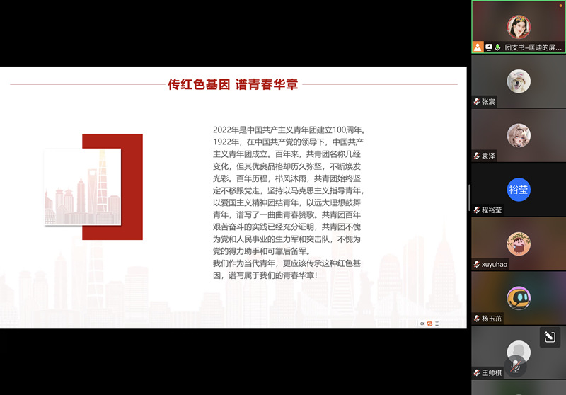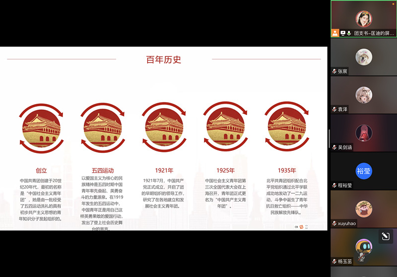 首先,匡迪同学通过观看视频与团课讲授的方式带领同学们回顾了共青团百年历史,她引用习近平总书记的话说道:“共青团百年历史波澜壮阔,百年初心历久弥坚。”中国共产主义青年团自创立之初为拯救中华民族、开辟新的革命道路付出了巨大的牺牲。新中国成立以来,代代有志青年时刻追随党的步伐,奋发图强,为社会主义建设贡献力量。时至今日,我辈青年共青团员,要继承和发扬共青团的优良传统,不断增进对习近平总书记和党中央的认同与追随。