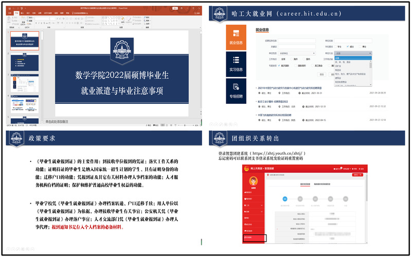 祁玥老师从就业信息收集渠道、签约流程、毕业派遣工作、党团组织关系转出等方面进行了详细阐述。她表示,同学们要积极利用哈工大就业网和校外平台,全面收集招聘信息,主动进行资源筛选整合,建立个人求职日历,尽早完成签约就业。随后,祁玥老师强调了派遣工作的重要性,指出不同城市就业派遣需要不同附加材料,希望同学们牢记时间节点,准确核对各项派遣信息。最后,祁玥老师就党团组织关系转出进行说明。