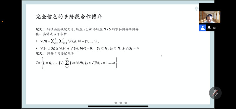 本次讲座的主题是《多阶段合作博弈与合作动态稳定性》。李寅博士首先介绍了Mksport体育和俄罗斯圣彼得堡国立大学联合校园的建设情况,并为同学们讲解了一些不同于我国的俄罗斯数学教育环节。在公司与圣彼得堡国立大学建设中俄联合校园的背景下,他期待未来两校之间进一步的学习、交流和合作。随后,李寅博士通过电影《加勒比海盗》为同学们深入浅出地讲解了博弈论的相关知识。通过运用大量有关实际问题的数学模型,他与同学们探讨了完全信息的多阶段合作博弈、分配补偿程序的动态稳定性、支付不可转移的多阶段动态博弈、支付补偿程序和子博弈的一致性等博弈论领域的专业问题,介绍了一些领域前沿的定义、概念和方法,丰富了同学们的学术知识与技术。