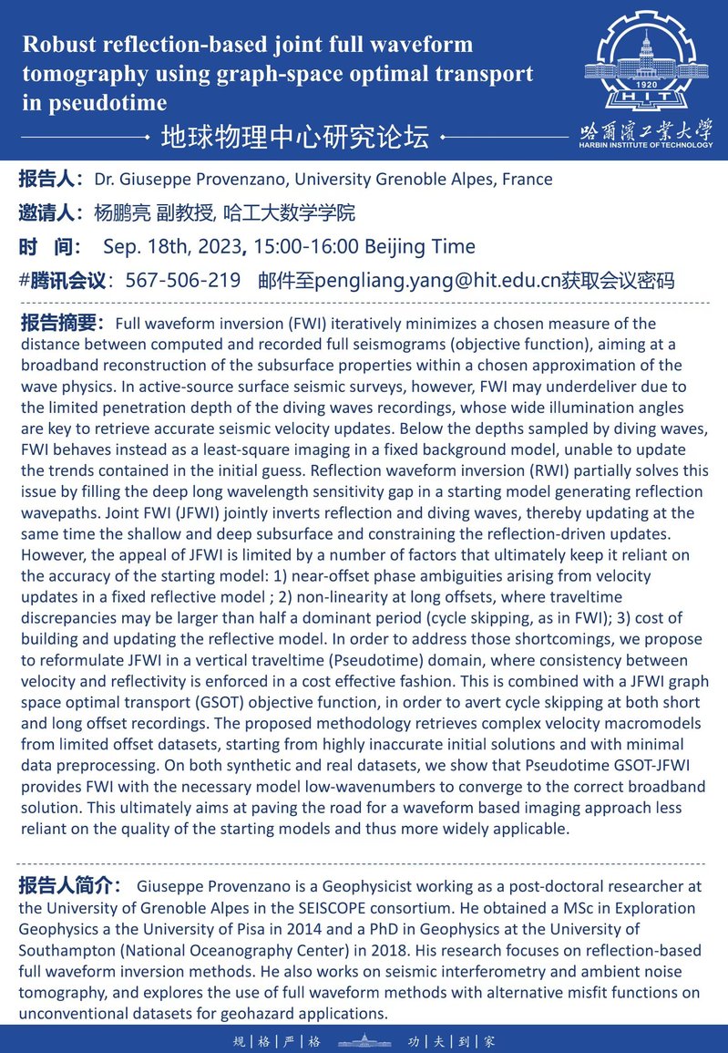 法国Grenoble 大学Giuseppe Provenzano研究员关于应用最优传输和伪时间域进行全波形反演的学术报告